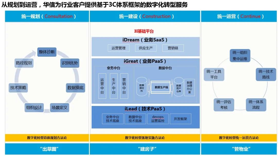 企业要通过技术和组织变革支撑数字化新能力建设,并最终驱动系统化的业务变革。大连华信形成的统一规划、统一建设、统一运营三个核心体系构成的3C体系框架,以数字化转型总体规划方法论、数字化转型落地实施方法论、数字化转型统一运营方法论,能够为企业建立战略规划、新能力、技术解决方案、组织治理体系、数字业务培育等关键过程的联动,推进企业转型落地。