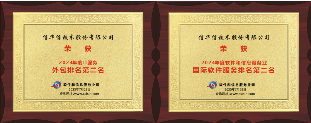 信华信荣膺“2024年度软件和信息服务业国际软件服务排名第二名” 、“2024年度IT服务外包排名第二名”